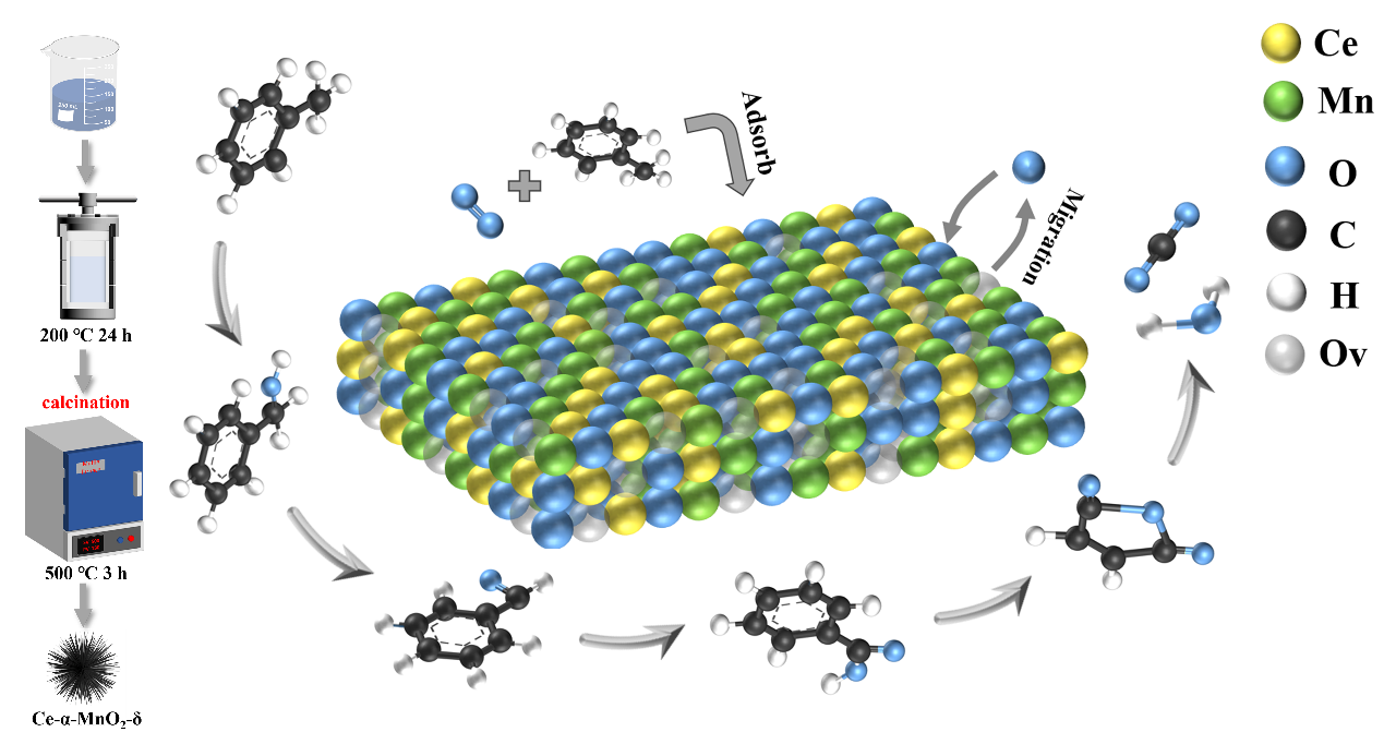 二氧化锰因其晶相可调节、天然丰度高、成本低和稳定性强等特点,被视为氧化分解VOCs的理想催化剂。然而,单金属MnO2对甲苯的催化降解性能有限。环境与安全工程学院张学军教授课题组对高性能二氧化锰基催化剂的制备与其催化氧化甲苯的性能进行了研究和分析,发现通过调控煅烧温度可诱导δ-MnO2向α-MnO2发生相变,实现催化剂由层状结构向隧道结构的转变。结构重构产生的晶格应力和畸变共同诱导了缺陷的形成和金属-氧键的弱化,增大了Ce-α-MnO2-δ催化剂的比表面积,提高了其氧化-还原循环速率,从而改善了甲苯催化氧化性能。2025年6月20日,相关研究成果以Promoting the Reactivity of Surface Lattice Oxygen in Ce Modified α‐MnO2 via a Structure Reconstruction Strategy for Toluene Oxidation为题发表在Small上。第一作者为理学院刘威副教授,第二作者为环境与安全工程学院硕士研究生俞红玉,共同通讯作者为环境与安全工程学院张学军教授和陈希副教授。沈阳化工大学为论文的第一单位。