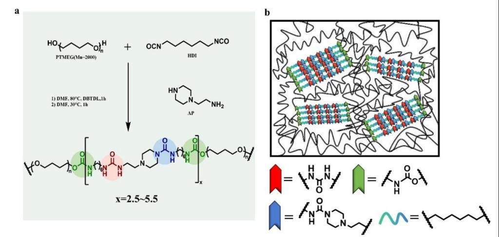 材料科学与工程学院王元霞副教授与清华大学化工系徐军副教授开展合作研究,自然界中蜘蛛丝、扇贝等启发,提出了一种调控多级氢键与硬段堆积的综合设计策略,制备了一种具有高强韧、抗损伤、抗冲击的聚氨酯/脲APPU弹性体。2025年4月30日,该工作以“Strong and Anti-impact Multi-functional Elastomer via Hierarchical Hydrogen Bonding Design”为题发表在Small上。文章的第一作者为沈阳化工大学硕士生王忠婷(清华大学化工系联合培养),清华大学化工系博士后史家昕、副教授徐军为论文通讯作者,沈阳化工大学王元霞副教授和清华大学化工系郭宝华教授为论文共同作者。沈阳化工大学为论文的第一单位。