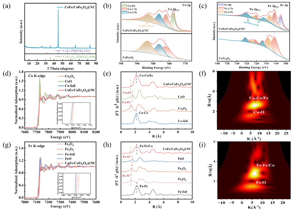 鉴于此,研究团队提出基于高碳含量Co-MOF的一步热解策略,通过原位组装构建了CoFe2O4薄膜包覆的CoFe合金纳米颗粒,并将其负载于氮掺杂石墨层中,形成CoFe/CoFe2O4@NC复合催化剂。其中,CoFe合金内核有效提升了材料导电性,并抑制CoFe2O4的团聚;原位形成的氮掺杂石墨层作为载体,既保护催化剂颗粒结构,又辅助电子快速转移。该催化剂在碱性介质中展现出优异的OER性能,过电位低至330 mV (50 mA cm-2),且能在50 mA cm-2电流密度下稳定运行100 h,性能显著优于商用RuO2及单一组分催化剂。本研究不仅阐明了CoFe与CoFe2O4界面通过优化电子结构、降低反应能垒提升活性的机制,还解决了传统尖晶石催化剂导电性与稳定性不足的共性难题。其基于MOF前驱体的一步制备策略,为平衡催化剂活性、导电性与稳定性提供了低成本解决方案,对OER催化剂的设计优化具有重要指导意义。