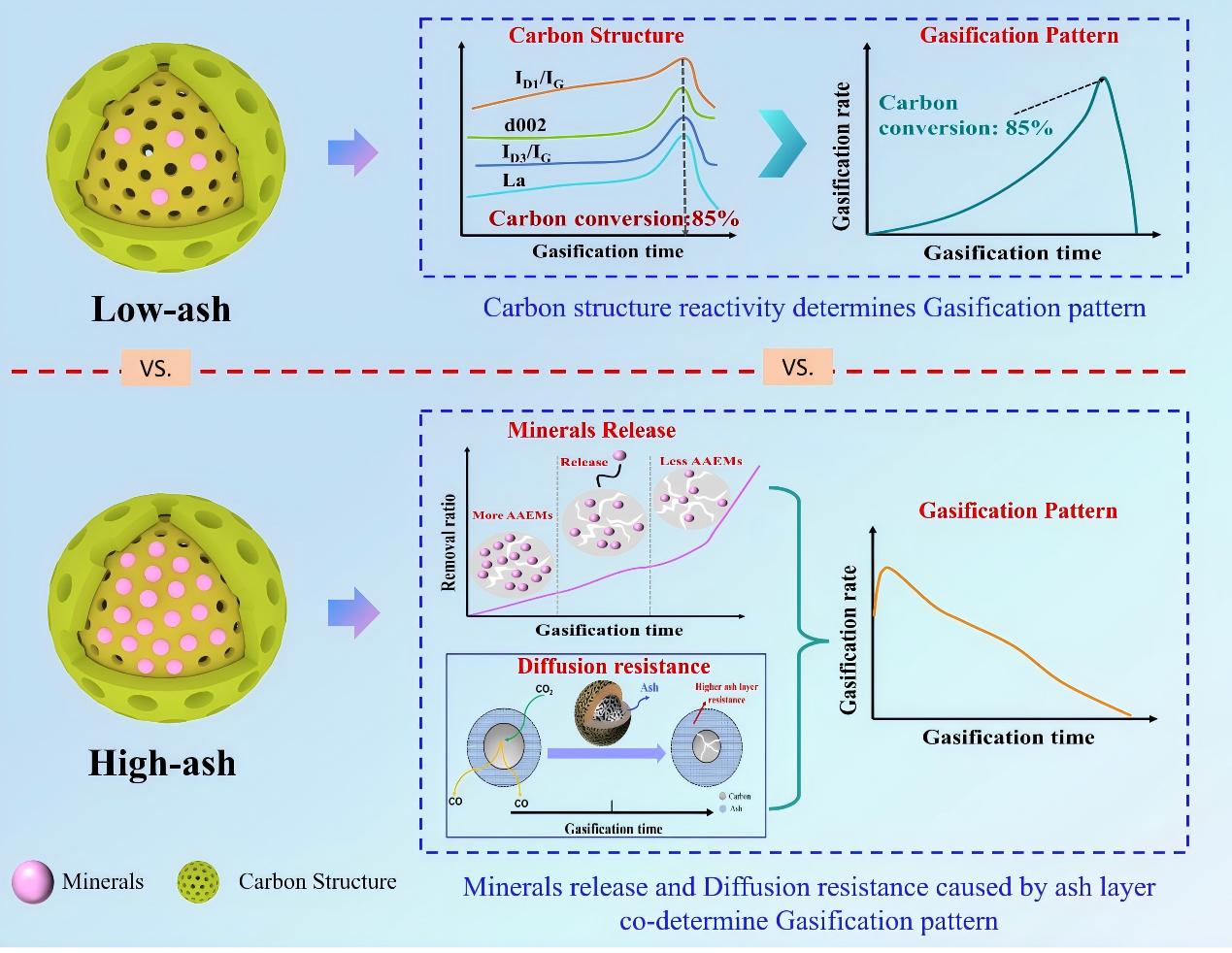 近日,我校资源化工与材料教育部重点实验室,依托自主研发的在线颗粒采样微型反应流化床,系统探究了不同类型生物炭的气化动态演变规律,并揭示其差异产生的本质原因。研究发现,低灰分与高灰分生物炭的气化速率随时间演变曲线存在显著差异:低灰分生物炭表现出 “下降-上升-下降” 的变化特征,而高灰生物炭则呈持续下降趋势。当高灰分生物炭脱除矿物质后,其气化特性与低灰分生物炭高度吻合,这一结果证实灰分含量是导致不同生物炭气化演变规律差异的决定性因素。此外,团队还建立了不同类型生物炭气化的新机理:低灰分生物炭的气化速率演变由碳结构本征反应性主导;而高灰分生物炭在气化过程中,因催化活性矿物质逐步释放、灰层阻力持续增加,其气化速率随时间呈持续下降趋势。本文研究成果进一步丰富并完善了生物炭气化理论体系,为不同类型生物质气化技术的研发与应用提供了重要理论支撑和实践指导。