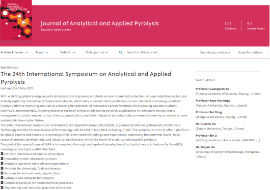 《Journal of Analytical and Applied Pyrolysis》(简称JAAP)创刊于1979年,由Elsevier出版。JAAP致力于发表有关热解过程创新应用、热解反应相关产物的表征以及反应机理研究的论文,目前杂志主编为我校王树荣教授。Pyro2024特刊编辑为沈阳化工大学许光文教授、名古屋大学Koyo Norinaga教授、清华大学杨睿教授、天津大学刘国柱教授、郑州烟草研究院李斌研究员、浙江工业大学胡艳军教授。