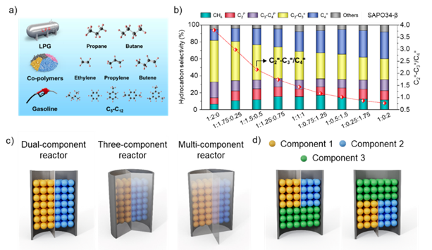 梁兵教授联合椿范立院士和马丁院士提出了一种双沸石调控策略,通过两种高定向性沸石的联合使用实现了目标产物内部组分的精准调控。研究团队以LPG产物为例对双沸石体系进行深入研究,并在二氧化碳加氢反应中开发一种并联的混合方式以解决双沸石之间的产物扩散与干扰问题。此外,他们还将机器学习方法应用到双沸石体系中,通过模拟实现对目标产物的精确预测和定制。这种新颖的策略被证明具有极大的成本优势和应用价值,并可被推广到其他产物乃至其他多相催化反应中。
