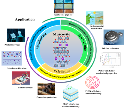 白云母作为一种层状硅酸盐,由于其特殊的结构特征,难以直接进行改性和剥离。然而,白云母独特的性能——尤其是其高长径比和紫外线屏蔽能力——吸引了世界各地的研究人员探索各种加工方法,以开发各种白云母基纳米复合材料。本文详细总结了近年来白云母改性、插层和剥离方面的最新进展。文章还回顾了白云母基纳米复合材料在传统(如:珠光颜料领域)和新兴领域(如:环境修复、二维材料生长基底、柔性电子材料等)的广泛应用。最后,指出未来的研究方向和关键方向,例如可控合成具有特定结构或性能的白云母,以及白云母基纳米复合材料的规模化生产,并强调了开发简便、环境友好的白云母功能化方法的重要性。
