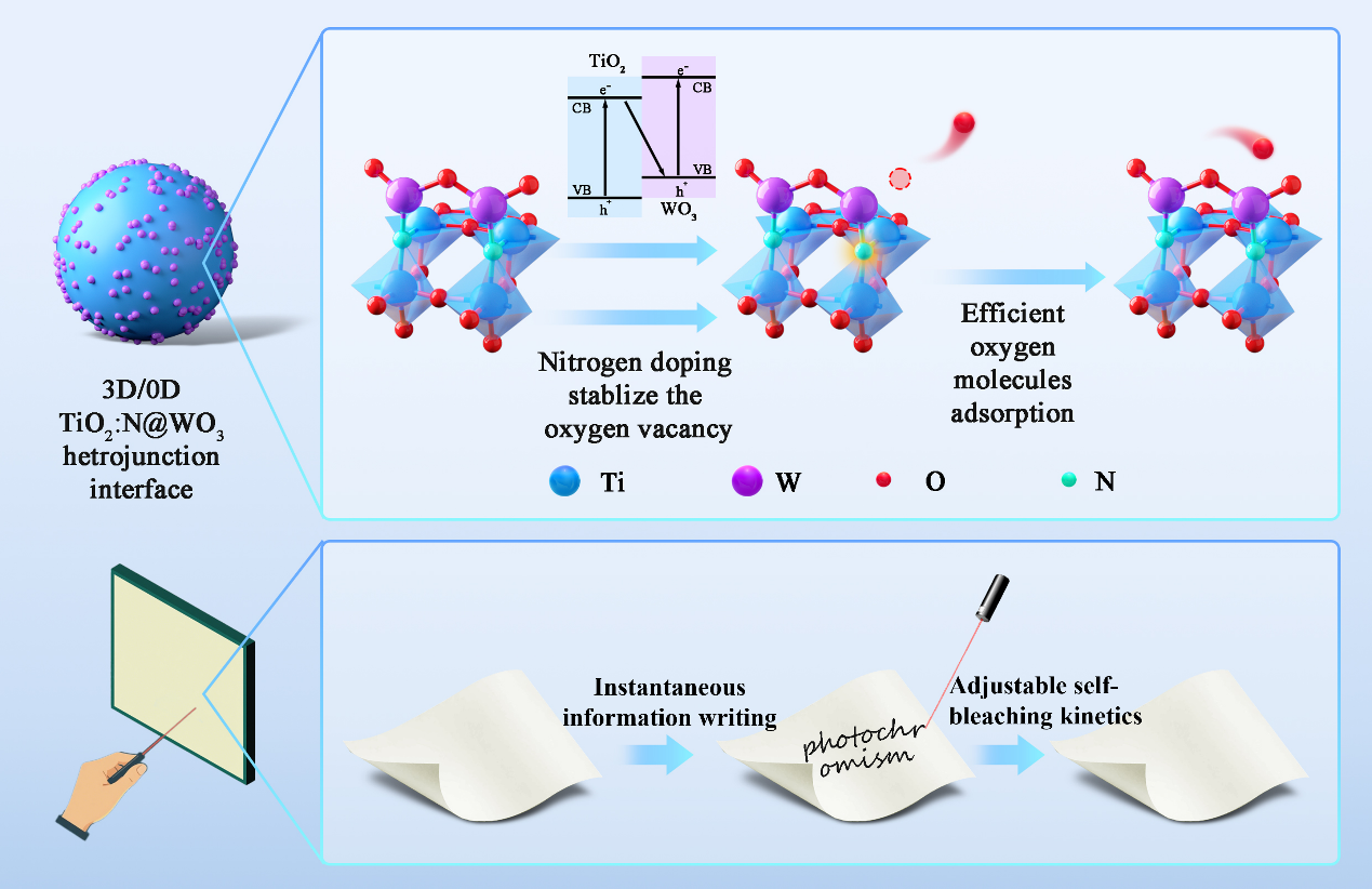 为应对上述挑战,化学工程学院绿色催化材料与过程技术研究团队开发了一种具备具备灵敏光响应与可控自漂白行为的Z型3D/0D TiO2:N@WO3异质结界面。该界面由零维纳米结构氧化钨(0D WO3)与三维纳米结构的氮掺杂二氧化钛(3D TiO2:N)构成(TiO2:N@WO3)。原位光照表征技术与理论模拟结果表明,该异质结界面不仅有效地促进了光生载流子的分离,且氮元素的供电子特性显著加速了光生电子的局域化行为,二者协同促进W5+的形成,大幅提升了氧化钨的光致变色速度。在低功率紫外光辐照下,TiO2:N@WO3可在几乎瞬间(约1秒)由黄色变为深蓝色。此外,3D TiO2:N不仅有效抑制了0D WO3的自发团聚,更重要的是显著增强了氧气分子的吸附能力,从而将自漂白时间从24小时大幅缩短至仅120秒,提升了自漂白动力学可控性。