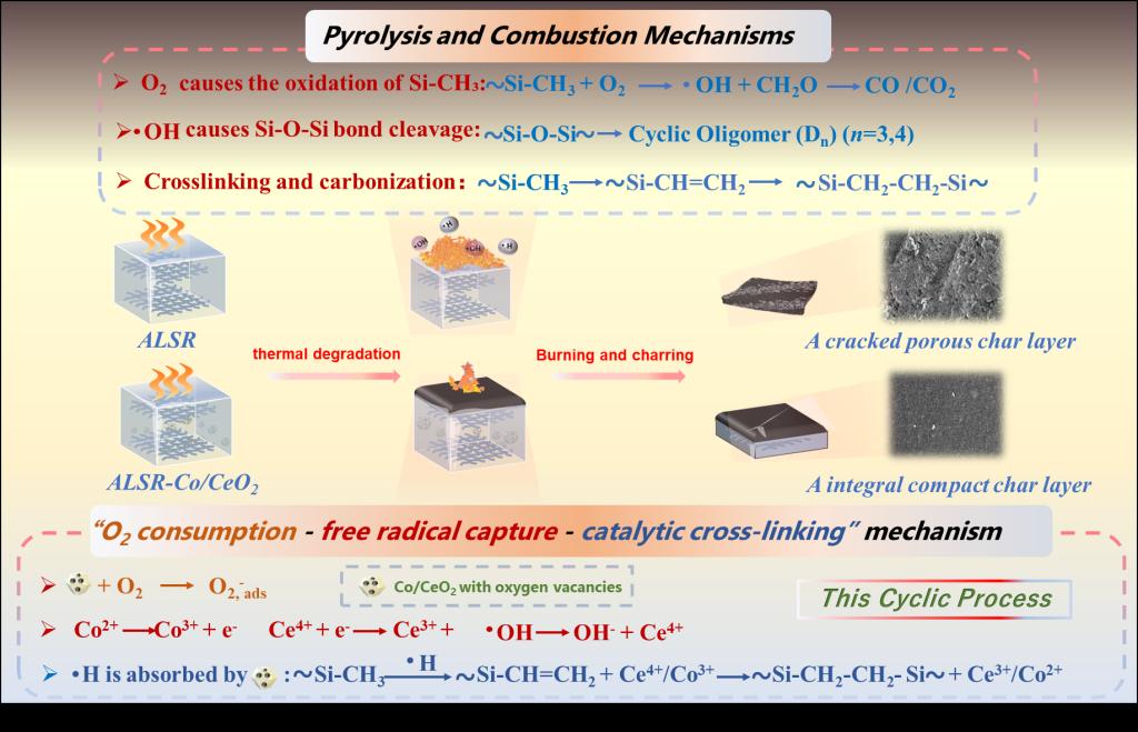 如上图所示,Co/CeO2提升ALSR耐热与阻燃的机理可概括为以下协同过程:在燃烧过程中,Co/CeO2通过吸附热氧,阻断氧气与ALSR热解释放的可燃挥发物(如烷烃、烯烃等)接触,抑制气相燃烧反应;其表面丰富氧空位可捕获并淬灭·H、·OH等关键自由基,直接中断燃烧链反应。这种耗氧、自由基淬灭与催化交联的协同机制,共同构筑了材料优异的热稳定性和阻燃性能。