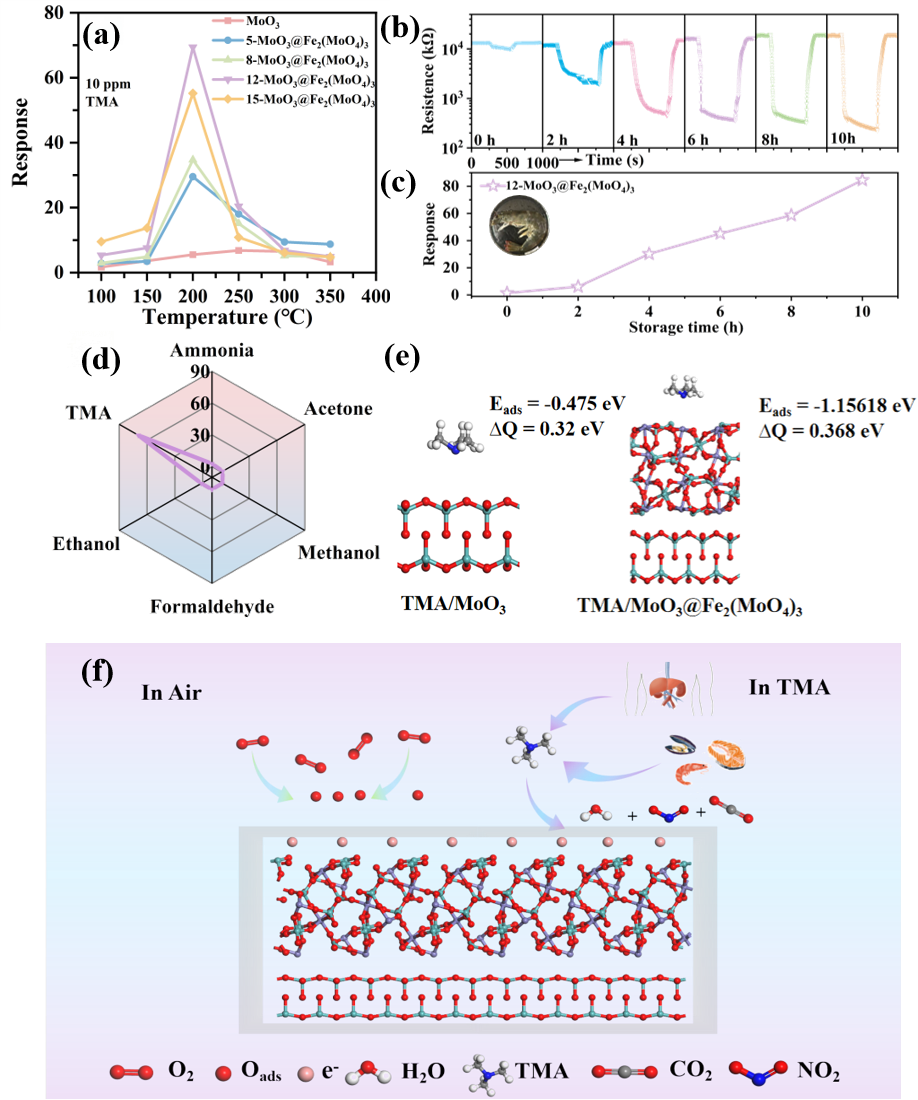 针对食品安全领域腐败标志物三甲胺(TMA)检测中存在的灵敏度低、响应速度慢等技术瓶颈,我校化学工程学院伞晓广教授、孟丹教授团队成功设计并构建了MoO3@Fe3(MoO4)3核壳异质结构材料,系统探究了该材料对痕量TMA的气敏性能及作用机制。研究表明,这种核壳异质结构可有效调控MoO3的电子结构,显著增强敏感材料表面Lewis酸性;同时,异质界面显著提升氧空位浓度,为气体吸附与表面反应提供了丰富充足的活性位点。此外,界面电荷转移效率的提升与材料的带隙剪裁,进一步强化了材料对TMA分子的吸附能力。