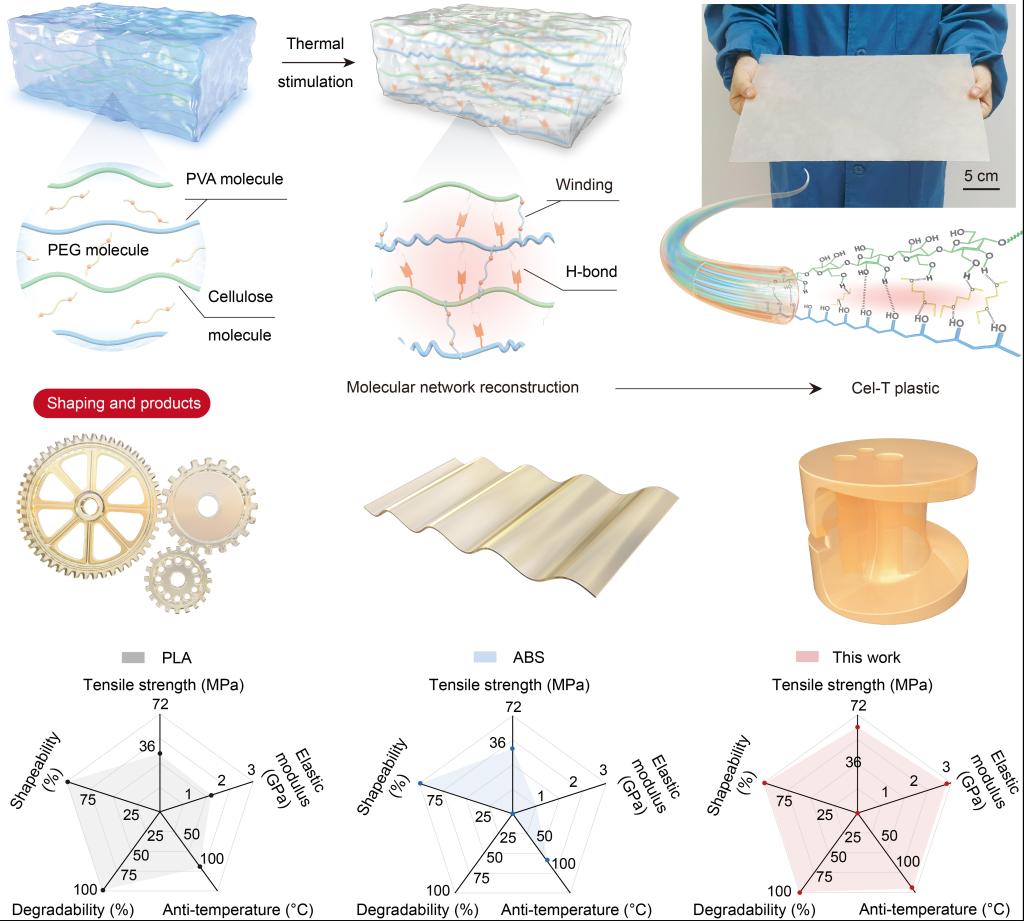 生物塑料被视为石化塑料的环保替代品,在全球产能逐年增长的背景下,开发兼具机械强度、热稳定性且易加工成型的生物基塑料仍面临挑战。近日,我校赵大伟教授与东北林业大学于海鹏教授、中国医科大学附属盛京医院孙丽莎教授合作,提出了一种“热刺激调控超分子构型重组策略”,引入热聚乙二醇分子优化纤维素与聚乙烯醇的超分子网络结构。得益于热刺激诱导的微观结构致密化与多组分协同增强机制,成功构建出兼具优异机械性能(拉伸强度63.86 MPa,弯曲强度108.6 MPa)、宽温域热稳定性(-40 ℃到135 ℃结构完整)、可控塑型性、闭环可回收性及55天自然可降解性的超分子纤维素热塑料(Cel-T)。