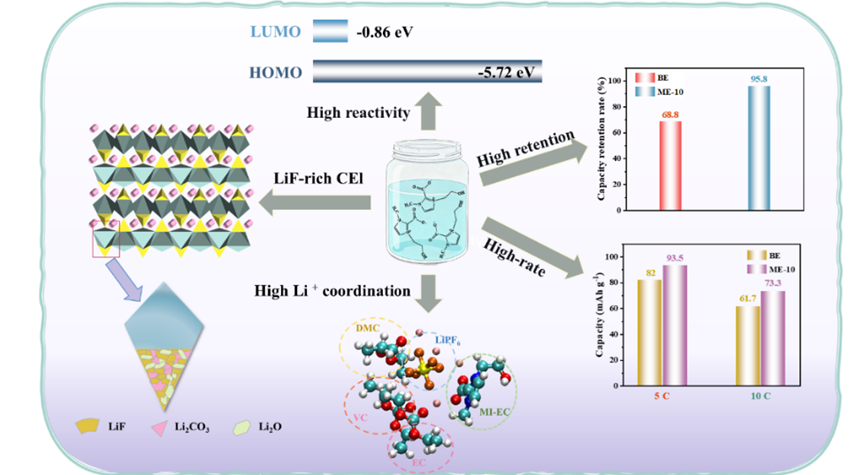 该研究不仅为开发高稳定性、高功率锂离子电池提供了可行的电解液添加剂策略,也为未来高性能储能材料的设计与应用奠定了理论基础。MI-EC的引入,标志着离子液体添加剂在实用化进程中迈出了重要一步,未来有望在动力电池、储能系统等领域实现更广泛的应用。