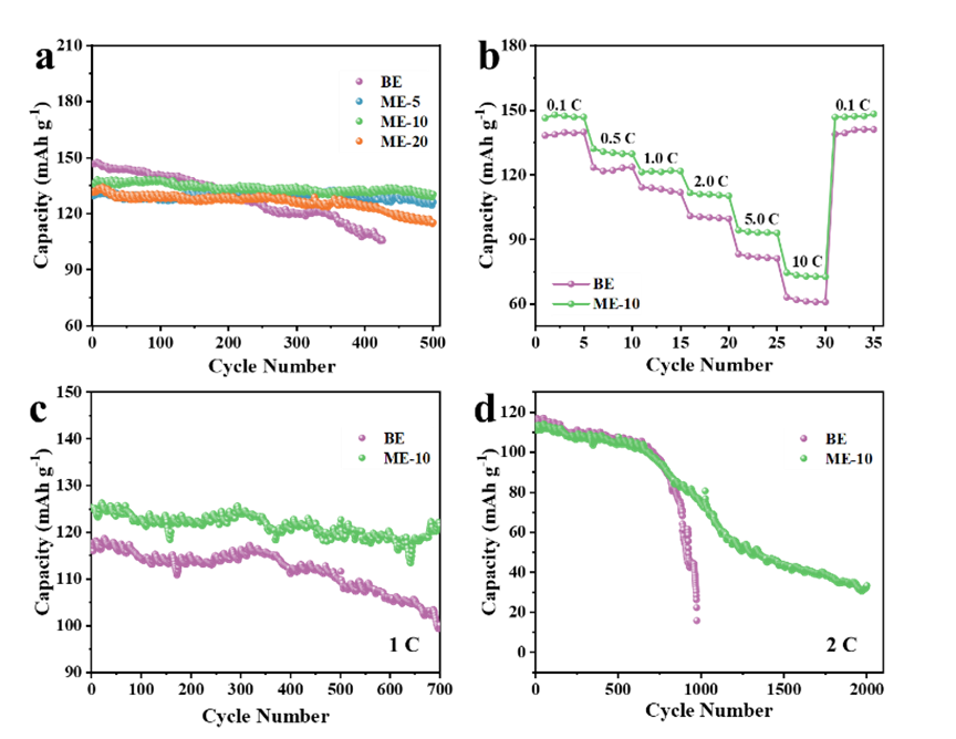 为验证MI-EC的实际性能,研究团队开展了系统的电化学测试和微观表征,结果显示,仅添加1 wt%的MI-EC(ME-10),就能让锂离子电池的性能实现质的飞跃。在LFP‖Li半电池中,0.5 C电流密度下循环500次后容量保持率达95.8%,较标准电解液(BE)提升27%;10 C高倍率下的容量较BE提高18.8%,充放电电压间隙仅100 mV,极化程度大幅降低。Li‖Li对称电池测试中,ME-10电解液的循环寿命从BE的150 h延长至270 h,提升80%。在石墨‖Li半电池和LFP‖石墨全电池体系中,MI-EC添加剂同样表现出优异的兼容性,大幅提升了电池的循环稳定性和倍率性能。微观表征结果进一步揭示了MI-EC的作用机制。SEM、TEM、AFM等表征显示,使用MI-EC后,电极表面更加平滑、SEI/CEI更均匀致密。XPS分析证实,MI-EC参与构建的界面层中,含氮组分和无机LiF含量增加,进一步增强了界面稳定性和离子传导性。