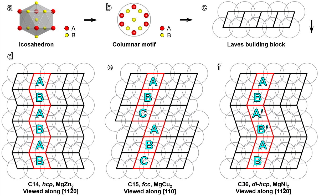 Laves相是重要的金属间化合物结构类型,主要包括MgZn₂型、MgCu₂型和MgNi₂型三类典型结构。与传统FCC或HCP结构以单原子层为基本堆垛单元不同,Laves相由多层二维Laves铺砌构筑块组成,其几何本质来源于二十面体柱的周期性铺砌,是各类Laves结构共享的基本框架。近年来,随着球差校正扫描透射电子显微技术的发展,研究人员陆续发现了基于Laves构筑块形成的更多复杂结构类型,包括非周期结构及具有五重旋转对称性的准晶结构。然而,作为基本结构单元存在的原子级单层Laves构筑块,此前始终缺乏直接实验验证。