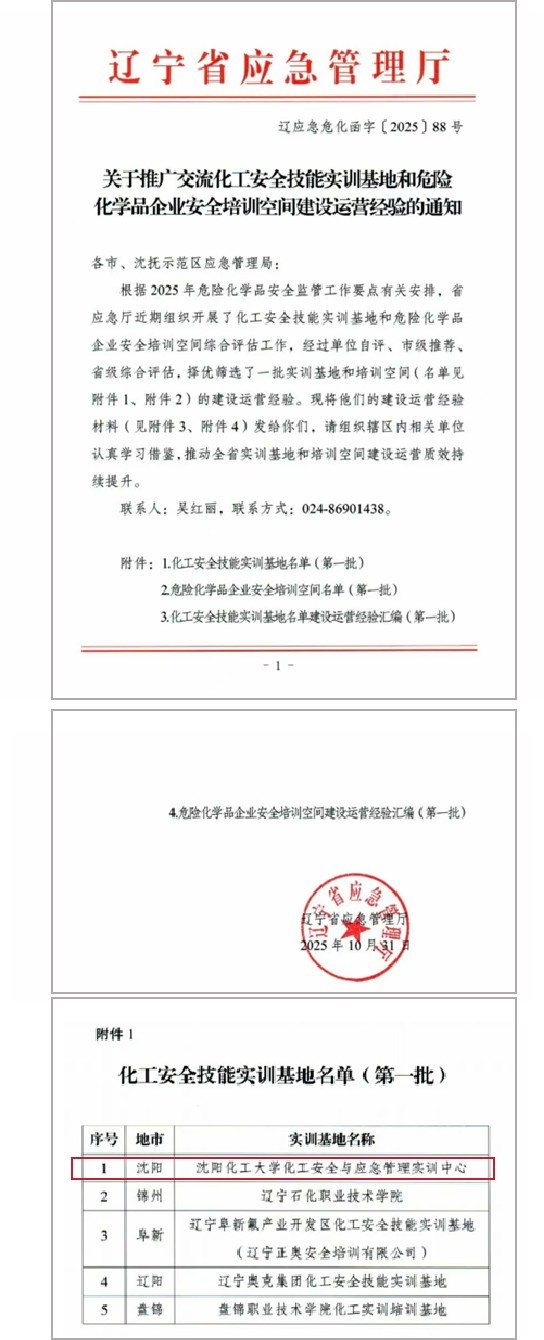 近日,辽宁省应急厅公布了《关于推广交流化工安全技能实训基地和危险化学品企业安全培训空间建设运营经验的通知》(辽应急危化函字【2025】88号),我校化工安全与应急管理实训中心入选辽宁省第一批化工安全技能实训基地,建设运营经验在全省推广。