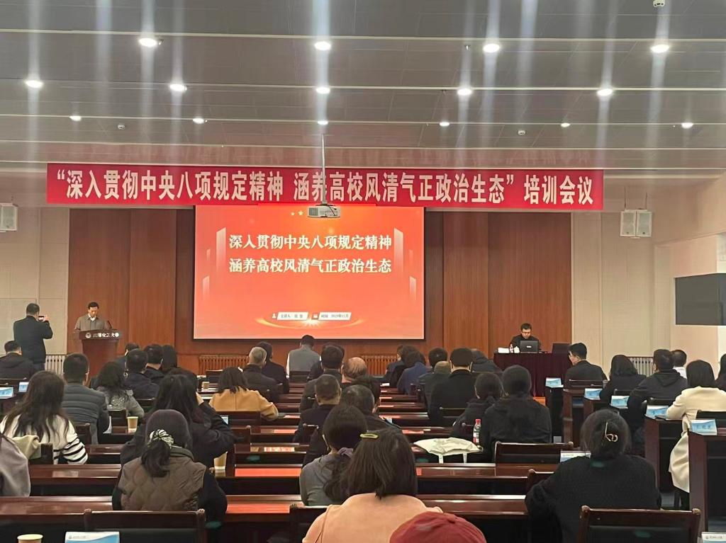为深入贯彻落实党的二十届四中全会精神,推动中央八项规定精神在高校精准落实,进一步强化干部队伍作风建设和纪检监察干部监督执纪业务能力水平,11月12日,学校组织召开“深入贯彻中央八项规定精神 涵养高校风清气正政治生态”培训会议。校党委副书记、副校长秦高梧,党委常委、副校长王国刚、王树荣、于三三出席会议,全体中层干部、基层党组织纪委书记(纪检委员)、专兼职纪检监察干部、科研院所负责人、教师代表参加会议。会议由纪委书记牛巨龙主持。