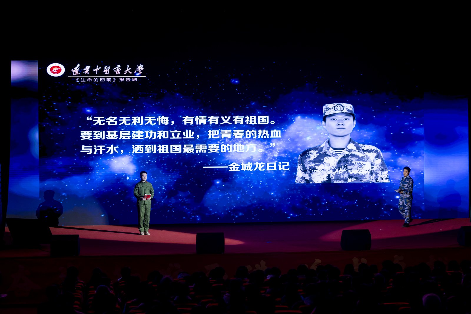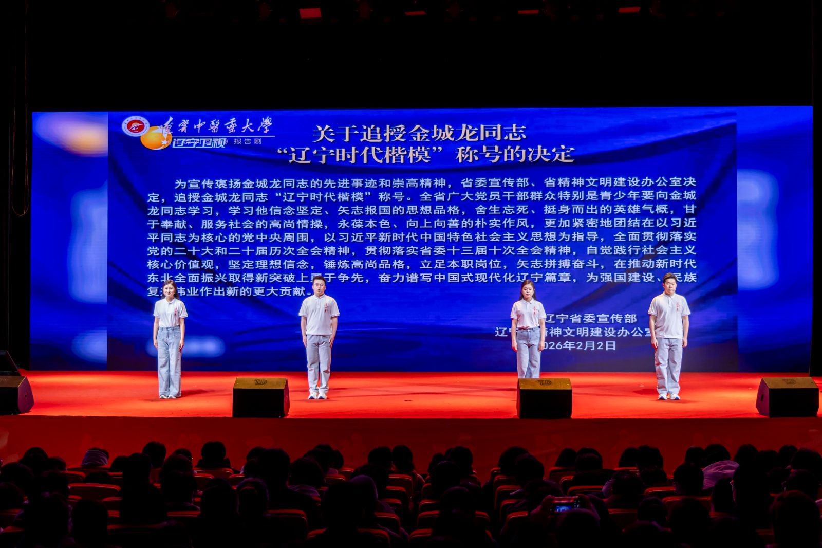 为深入学习弘扬“辽宁时代楷模”金城龙同志的先进事迹,传承红色基因与雷锋精神,厚植青年学子家国情怀与责任担当,3月12日,学校特邀辽宁中医药大学主创团队,以金城龙同志真实事迹为蓝本的原创报告剧《生命的回响》在我校大学生活动中心演出。党委副书记汪滢,党委宣传部、党委学生工作处、党委研究生工作处、校团委、马克思主义学院负责人,思政教师、辅导员以及学生代表等1200余人共同观看报告剧。