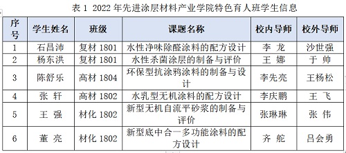先进涂层材料产业学院是由沈阳化工大学材料科学与工程学院与沈阳顺风实业集团于2021年合作建立,目的是为了进一步增进校企联合,提高教育教学水平。先进涂层材料产业学院实行校企双导师制。学校青年教师利用自身科研能力优势,被聘任为企业的“技术工程师”;而企业工程师则利用自身丰富的实践经验,被聘为学校的“校外指导教师”。在2022年本科毕业设计环节中,部分论文课题由顺风企业提供,学生的毕业论文将由校企双方导师共同指导完成。