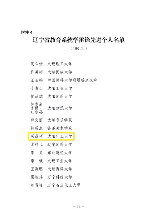 为贯彻落实习近平总书记关于弘扬新时代雷锋精神的重要指示批示精神,庆祝中国共产党成立100周年,广泛进行雷锋事迹、雷锋精神和雷锋式模范人物的宣传教育,辽宁省委教育工委、辽宁省教育厅决定,对全省教育系统100个学雷锋先进集体、100个学雷锋先进个人以及49个优秀学雷锋志愿服务项目给予表彰。其中,我校应用技术学院分团委书记、辅导员冯薪硕获得“辽宁省教育系统学雷锋先进个人”称号。