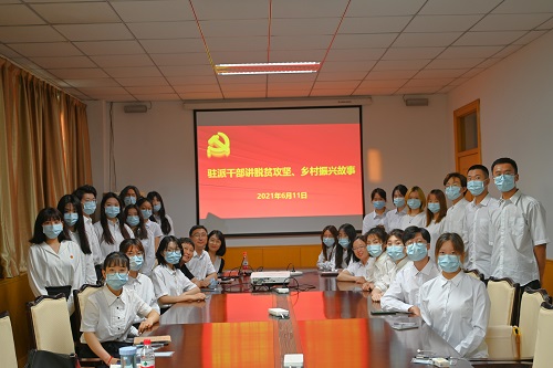 于丰刚,我校学生工作处主任科员,现阜新市阜蒙县招束沟镇经济发展办公室主任。党课上,他结合驻派经历和参与百村调研,讲述了脱贫攻坚、乡村振兴的故事,矢志农村农业发展有情怀的村书记、农村村容村貌与村民收入的可喜变化、以抖音、公众号等新媒介推广乡村文旅、把驻派和调研工作所得指导学生参加“青年红色筑梦之旅”创新创业大赛等。他说作为一名党员,一名选派驻镇干部,很幸运能够奋战在脱贫攻坚一线,见证了国家脱贫攻坚战取得了全面胜利,感受并践行“上下同心、尽锐出战、精准务实、开拓创新、攻坚克难、不负人民”的脱贫攻坚精神。未来他将围绕立足新发展阶段、贯彻新发展理念、构建新发展格局带来的新形势、提出的新要求,投入到乡村振兴的伟大实践中。