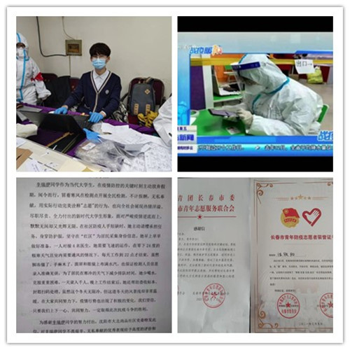 汪欣阳,2020级计算机2002班学生,在2021年长春市防疫关键时期,主动报名担任志愿者,开学初,学院收到共青团长春市委的感谢信。感谢信中指出,2021年1月,在长春市防控新冠肺炎疫情的关键时刻,沈阳化工大学汪欣阳同学积极响应共青团长春市委号召,在全民核酸检测工作中协助开展登记、测温、秩序维护等志愿服务,该同学在工作中主动担当、不辞辛劳、热情奉献,得到了长春市基层党委、政府和群众的一致好评,充分展现了新时代青年的良好风貌。特致此信,向汪欣阳同学提出表扬,并向沈阳化工大学对长春市青年防疫志愿服务工作的大力支持表示崇高的敬意和衷心的感谢!
