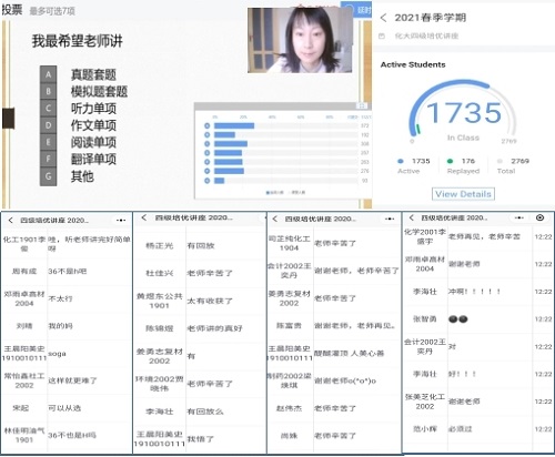 在第一讲中,外国语学院副院长崔晗副教授为学生们讲解了最新的一套四级真题,并将答题技巧编成“口诀”,学生们用弹幕回应“听老师讲完好简单呀”,“我悟了”,“太有收获了”,并在老师的鼓励下纷纷表示一定努力,四级“必须过”。崔晗副院长也对学生们的学习情况和需求进行了进一步的调研,以便更好地调整后面的讲座内容。