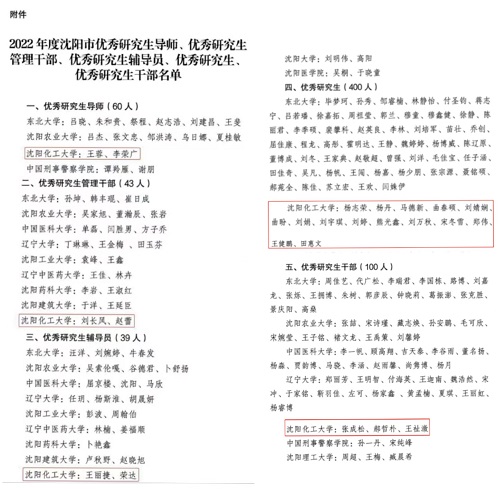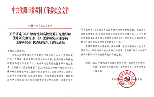 在2022年度中共沈阳市委教科工作委员会组织开展的沈阳高校优秀研究生导师 优秀研究生管理干部 优秀研究生辅导员 优秀研究生 优秀研究生干部评选活动中,我校王蓉、李荣广等2位研究生导师被评为沈阳市优秀研究生导师,刘长风、赵蕾等2位老师被评为沈阳市优秀研究生管理干部,王丽捷、荣达等2位老师被评为沈阳市优秀研究生辅导员,杨志荣、杨丹、马德新、曲春硕、刘婧娴、曲盼、刘娟、刘宇琪、刘婷、熊光鑫、刘万秋、宋冬雪、郑伟、王健鹏、田惠文等15名同学被评为沈阳市优秀研究生,张成松、郝哲朴、王祉溦等3名同学被评为沈阳市优秀研究生干部。