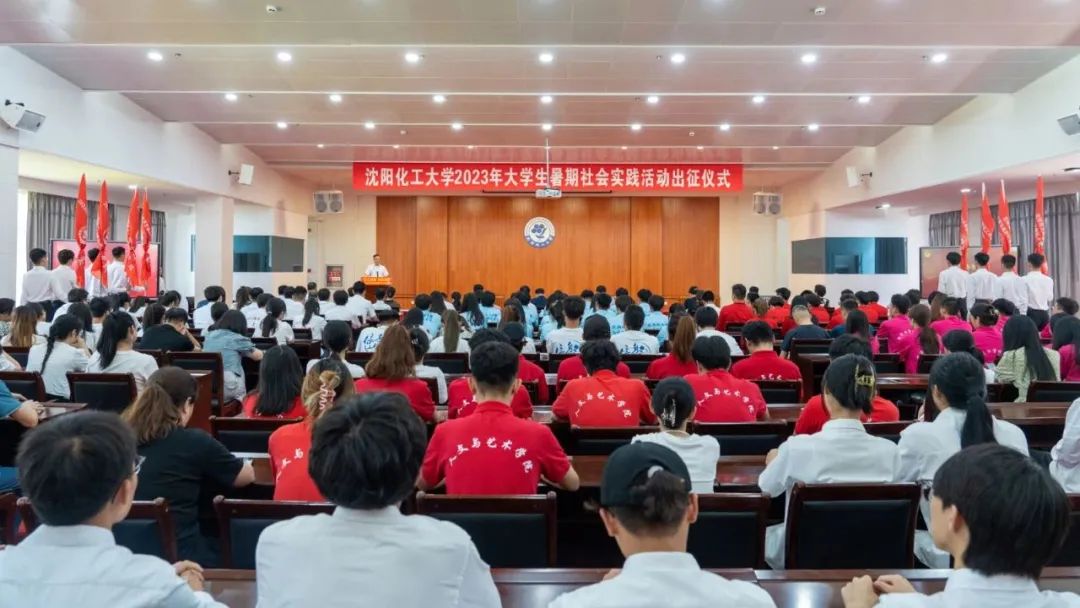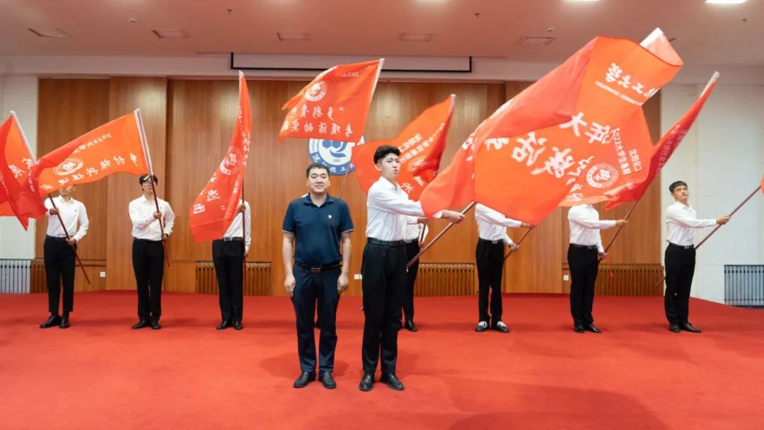 党委副书记周志强为“沈阳化工大学2023年大学生暑期社会实践总队”授旗;部分职能部门负责人为八个校级重点实践项目团队授旗。