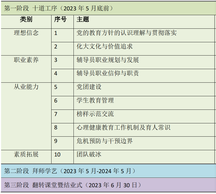 近年来,随着我校辅导员专业化、专家化建设水平不断提升,新辅导员入职培训体系逐步系统化、科学化,形成了“十道工序”“拜师学艺”及“翻转课堂”三阶段体系。