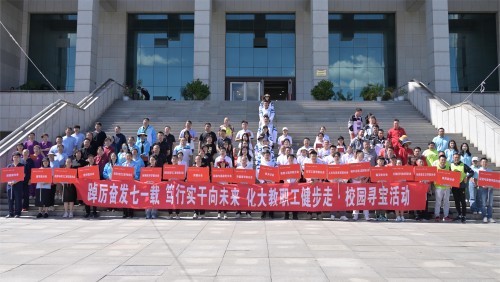 9月19日是化大校庆日。中午,“踔厉奋发七一载,笃行实干向未来”化大教职工健步走、校园寻宝活动在图书馆门前举行,沈阳化工大学党委副书记周志强出席了活动。活动由校工会主办,材料学院、计算机学院工会承办,来自20个部门工会的教工参加了活动。