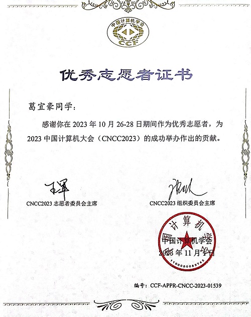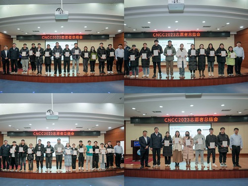 CNCC2023志愿者委员会主席、沈阳化工大学教授王军回顾了本届志愿者在CNCC2023期间的工作内容和成果。他对本次志愿者服务工作给予了肯定,并对各位志愿者和带队老师的付出和努力表示感谢。同时指出此次大会志愿服务创下了两个历史新高,一是志愿人数高达200余人,创历史新高;二是全体志愿者学历均为硕士研究生、甚至是博士研究生,是志愿者学历最高的一届。随后进行了志愿者颁奖环节,中国计算机学会秘书长唐卫清研究员和王军教授为志愿者颁发感谢证书并合影留念。各学校志愿者代表上台发言,表达了对CNCC志愿者工作的热情和感谢,分享了工作感想,认为本次工作受益匪浅,结识了许多新朋友并开阔了眼界、增长了知识。