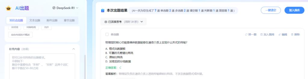 教师可以利用课程网站提供的AI出题模块,精准分析学生学习动态,根据知识点掌握情况,自动形成相关试题,并发放给学生,让学生能进一步理解和掌握相关知识点内容。