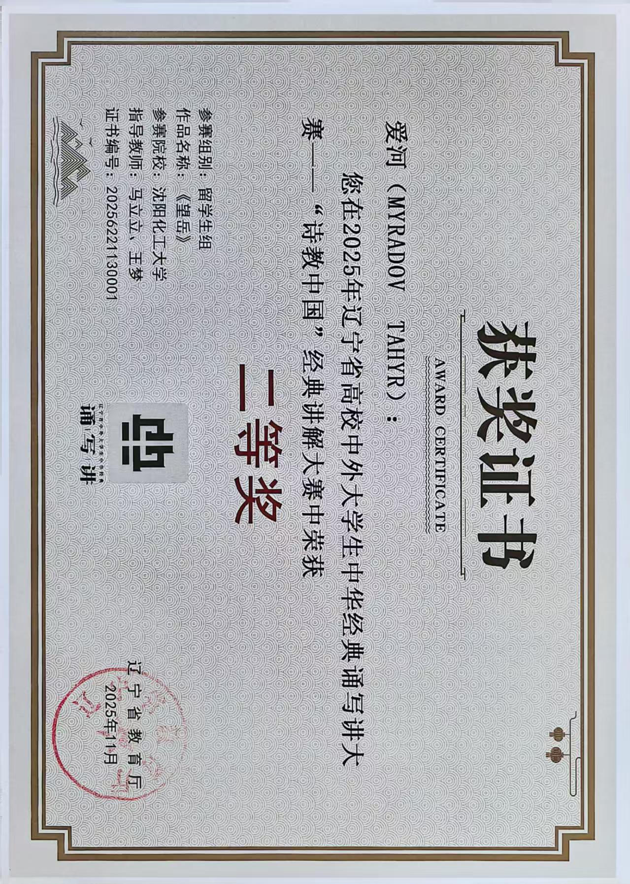 与此同时,土库曼斯坦籍留学生爱河还在2025年辽宁省高校中外大学生中华经典诵写讲大赛——“诗教中国”经典讲解大赛中斩获二等奖,为学院在省级赛事中再添荣誉。