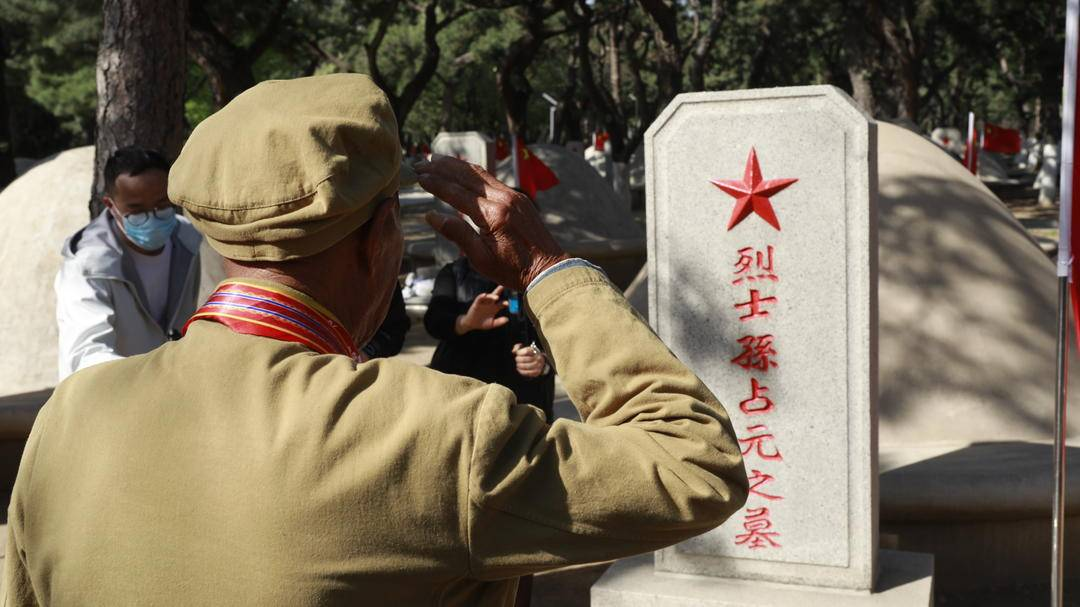 老战士向志愿军烈士敬礼。