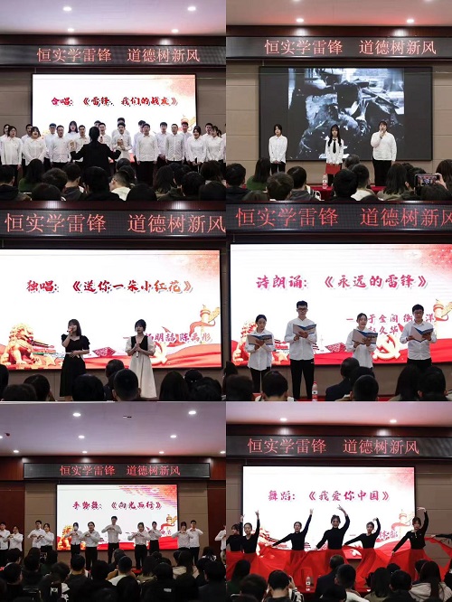 本科学生党支部书记李特介绍本次“恒实学雷锋,道德树新风”雷锋活动晚会以传承新时代雷锋精神为主旨,以道德典范为榜样,发挥朋辈引领效应,在春天的校园内传递温暖。“身为新时代主力军,我们不仅要向雷锋同志看齐,也要向身边的同学们学习,把奉献、友爱、互助、进步、敬业、节约等精神发扬光大,始终保持一种积极主动的生活态度,以饱满的热情和充足的干劲投入到工作、学习之中去。”党总支副书记王帮贺致开场词并宣布晚会正式开始。