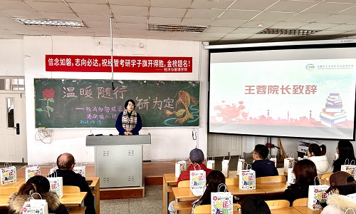 王蓉院长代表学院对考研学子寄予殷切厚望,送上祝福和嘱托,为他们加油打气。她鼓励同学们自信迎考、沉着应考、顺利赢考,并在考研复习方式和考试答题技巧上进行了指导。随后,学院领导带着满满的祝福和期盼为考研学子送上“暖心大礼包”,让同学们一定要坚定信念、披荆斩棘、决战最后时刻。