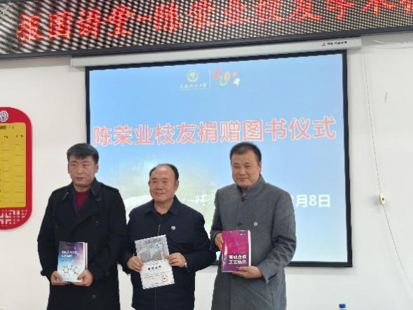 报告结束后,举行了陈荣业校友图书捐赠仪式,陈荣业教授将其个人专著赠予母校,校友总会办公室主任王成琛和理学院院长李文泽代表学校和学院接受此份厚礼。这些专著是陈荣业教授将毕生所学理论知识应用于实践的成果,他以专著回馈学校,表达了拳拳爱校之心。