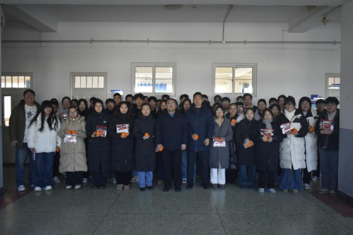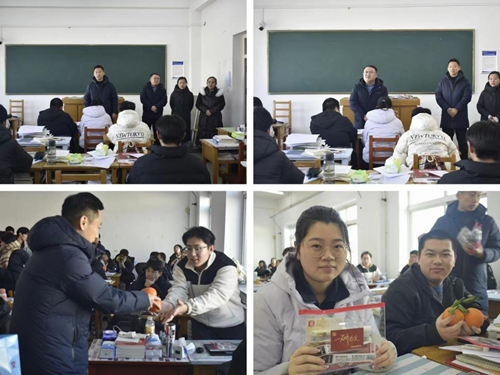 随后,老师们为同学们送上精心准备的考研暖心礼包:一套寓意“下笔流畅、金榜题名”的考试文具,一份象征“心想事橙一战橙功”的橙子礼盒。小小的礼包承载着学院的深切关怀,甜甜的橙子饱含着满满的美好祝愿,让同学们在寒冬备考路上倍感温暖与力量。一份礼包,一份期许;一声祝福,一份力量。收到礼物的同学们脸上满是笑容,纷纷表示感受到了学院的温暖与支持,并齐声高喊“全力以赴,一战橙功”的响亮口号,坚定的声音回荡在自习室的每一个角落。
