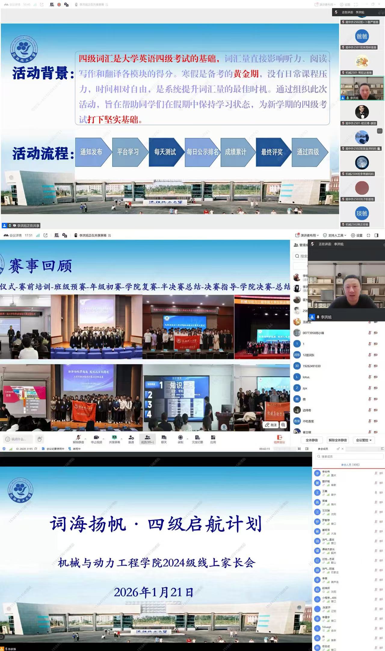1月20日、21日,学院分别召开2024级、2025级线上家长会,李洪旭及大一、大二辅导员出席。家长会上,学院以学业规划和职业规划为主要方向,向学生和家长汇报上一学期学院在“英语四级挑战赛”和职业规划大赛中取得的成果。李洪旭强调通过英语四级考试和做好职业规划对于学生学习内驱力的提升和未来职业道路发展十分重要,希望家长能够与学校一同监督学生认真参与即将开展的“2026年寒假英语四级挑战赛”活动,鼓励学生积极参与职业规划大赛,早日通过英语四级考试,未来都能从事心仪的工作。会上也为家长和学生就学业预警、假期安全、防诈反诈、奖助政策等进行简要讲解。