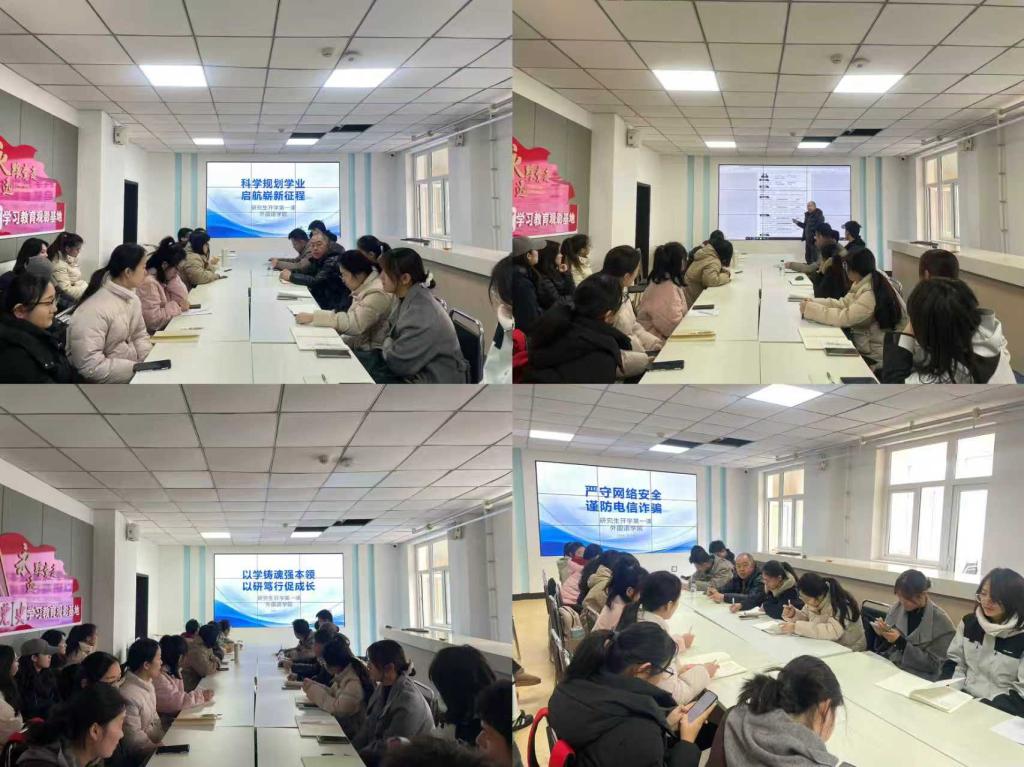 为筑牢研究生新学期学习科研根基,明确成长发展方向,3月10日,外国语学院在“一站式”学生社区成功召开了新学期研究生“开学第一课”。本次课程由外国语学院党总支副书记金鑫主讲,课程围绕校园安全、学业深耕、防范电信诈骗三大核心内容展开,为研究生新学期成长成才指引方向、保驾护航。