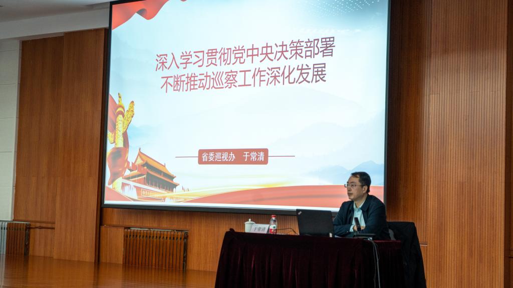 动员部署后,省委巡视办巡察指导处处长于常清为全体参会人员作了以《深入学习贯彻党中央决策部署,不断推动巡察工作深化发展》为题的专题培训。于常清处长围绕准确把握巡察政治定位、准确把握政治巡察监督重点和监督路径等七个方面,结合具体案例,深入全面地解读了高校巡察工作的重要意义、监督重点和工作要求。本次专题培训,对我校贯彻落实好新修订的《中国共产党巡视工作条例》,贯彻落实好党中央、省委关于巡察工作的新部署新要求,高质量开展新一轮巡察工作,具有很好的启示和指导作用。