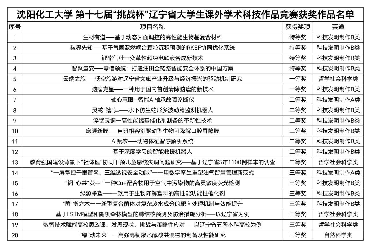 第十七届“挑战杯”辽宁省大学生课外学术科技作品竞赛决赛于6月8日举办,由共青团辽宁省委、省教育厅、省科技厅等多部门联合开展。我校团委提早谋划、精细组织,经校赛选拔、省赛初评与决赛答辩等环节激烈角逐,在本次竞赛中取得优异成绩,获得辽宁省特等奖4项、一等奖2项、二等奖7项、三等奖7项。